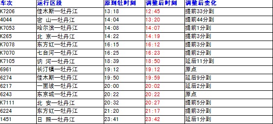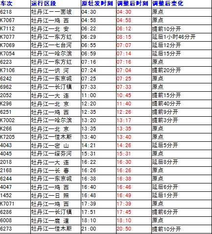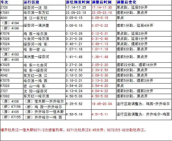 其间车次变化如下:将增开牡丹江--佳木斯普客6271/2次,6271次自11月22日起开行,牡丹江站6时45分发车;齐齐哈尔--佳木斯4105/6次调整为齐齐哈尔--鸡西K7155/6次运行,即增加一趟夜间从牡丹江站去齐齐哈尔的列车。K7155/6次均自11月22日开行。K7156次牡丹江站20时04分发车,次日6时20分到达齐齐哈尔站。