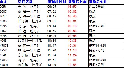 牡丹江站2011年11月22日调图新旧变化对比表。
