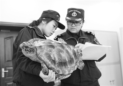 经鉴定,该物种属于国家二级保护野生动物,并列入濒危野生动植物种国际贸易公约(CITES)的附录一管理范畴,禁止商业性国际交易。目前,该起案件已移交哈尔滨海关缉私局作进一步处理。2013年,邮办处查获违禁物品主要有绿海龟标本、玳瑁标本、子弹、虎骨、象牙制品等。