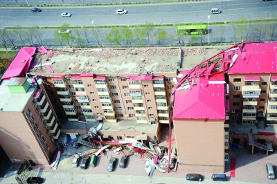 “轰隆隆的声音太吓人了,像地震,又有点像爆炸声。”该小区居民马强告诉记者,他停在楼下的轿车被掉落下的钢筋砸坏了风挡玻璃。“凌晨一点多风很大,还下着小雨,巨响过后我赶紧跑到窗前去看,但什么都看不清。等物业工作人员赶来后路灯才亮起来,这才发现楼顶的彩钢板给刮下去了。”马强说。