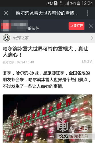 2月24日,国内某知名新闻客户端转发了《哈尔滨冰雪大世界可怜的雪橇犬,真让人痛心》一文,并且发布到手机客户端推荐栏中。对此,哈尔滨冰雪大世界宣传负责人表示,此前冰雪大世界已经发布,若有人再蓄意对“哈尔滨冰雪大世界狗拉雪橇项目致狗死亡”等消息转载,哈尔滨冰雪大世界将对其进行法律追究。