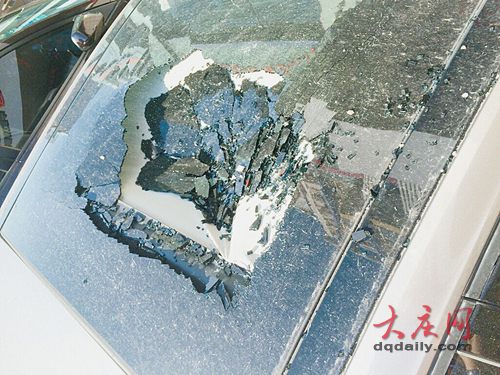 记者赶到现场,看到一辆大众高尔夫轿车天窗被砸出一个大窟窿,风挡玻璃也出现细密的裂痕,前部车漆也破损了。