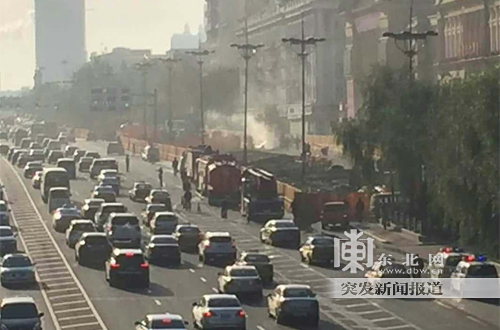 记者闻讯赶到现场看到,哈尔滨工人文化宫门前被黄色围挡围住的工地有黑烟冒出,现场没有明火。消防官兵正在现场进行扑救,有警务人员对事发现场进行安全管制。