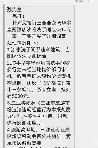 2.涉事华宇皇冠酒店洗手间收费行为未经当地物价部门审批,收费票据未经物价检查机构监制,违反了《价格法》第十三条规定,予以立案,拟处罚5000元。