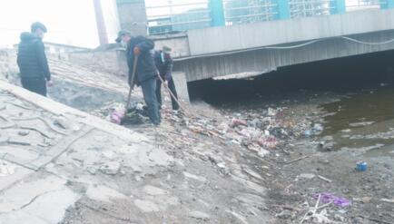 12日上午8时左右,记者途经王三五河安庆桥段看到这样一幕,三名年龄不等的男子,戴着口罩和手套,手里拿着扫帚、铁锹等工具,正在桥下河堤上埋头清理着河道里的垃圾,把能够到的包装纸、枯树枝、塑料袋、碎酒瓶等垃圾堆成堆,当遇到铁锹铲不动的垃圾时,他们就用手去拾拣,把所有的垃圾都装进胶丝袋里,然后抬到王三五河堤坝上。虽然天气寒冷,但他们却干得热火朝天,鬓角已被汗水浸湿。