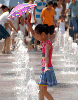 东北网7月19日电 进入伏天之后,哈尔滨市气温较高,位于哈尔滨市建筑艺术广场的音乐喷泉成了许多小朋友避暑的好去处。