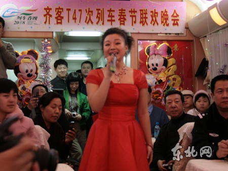 东北网2月10日电 (记者 杨尚峰) 春节期间,在哈尔滨铁路局齐齐哈尔客运段T47次旅客列车的车厢里,由铁路员工自己编排的节目,为节日里出行的旅客送来节日的祝福。列车乘务员都说:“虽然春节不能回家陪家人,但为乘客带来快乐,都感到很高兴。”