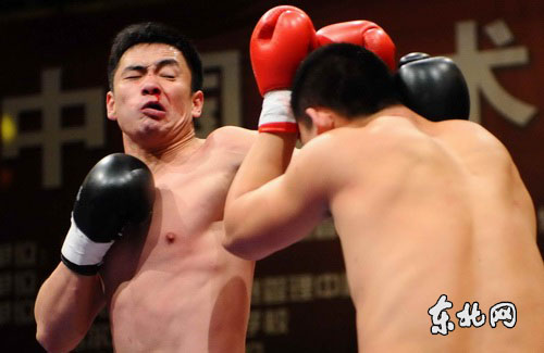 13日的第一场比赛中,红方是来自煤矿体协、几乎没有任何比赛经验的小将镇江湖陈东,黑方则是来自北京体育大学实力超群战功卓著的散打名将傲世苍龙黄磊。比赛刚一开始,黄磊便以一记漂亮的转身高边腿向陈东施以颜色,陈东随即以重拳发动反击,不料未能击中黄磊,反倒被黄磊抓住机会,用一记抱摔狠狠摔落在擂台之上。然而正所谓初生牛犊不怕虎,陈东没有被黄磊逼人的气势吓倒,反而利用黄磊一记高边腿的空隙降其摔落在地。此后黄磊发动了疯狂的进攻,尽管陈东也曾有几次有效的防守,但还是吃了不少重拳。第二局比赛,黄磊完全占据了场上的优势,开场没多久就轻松将陈东击倒在地,之后黄磊的进攻越发凌厉,一连串的组合动作一波猛似一波,而此时的陈东已经无力进行低档,在第二局比赛还剩一分零三秒的时候,裁判判定黄磊优势胜利赢得了比赛。