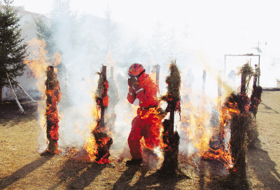 东北网4月16日讯 针对新战士初次参加扑火作战,容易产生畏惧心理的实际,森林部队结合实践累积,研究出一套心理行为仿真训练法。通过此项仿真训练,能够极大增强官兵心理承受能力,从容应对火场上发生的紧急情况,特别是对新战士打消胆怯心理提供帮助,目前这种训练方法已在森林部队各单位组织实施。图为战士进行穿火障训练。