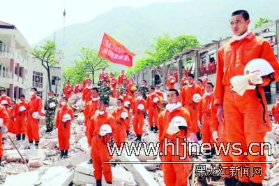 从都江堰到汶川,从绵阳到北川,从大山里的水磨镇、漩口镇到三江乡,黑龙江省公安消防总队赴川地震抢险救援队员们,头戴着红色地震抢险救援头盔,穿行于城市和乡村。截至19日12时,他们共转移受灾群众41人,搜救被埋压人员192人。