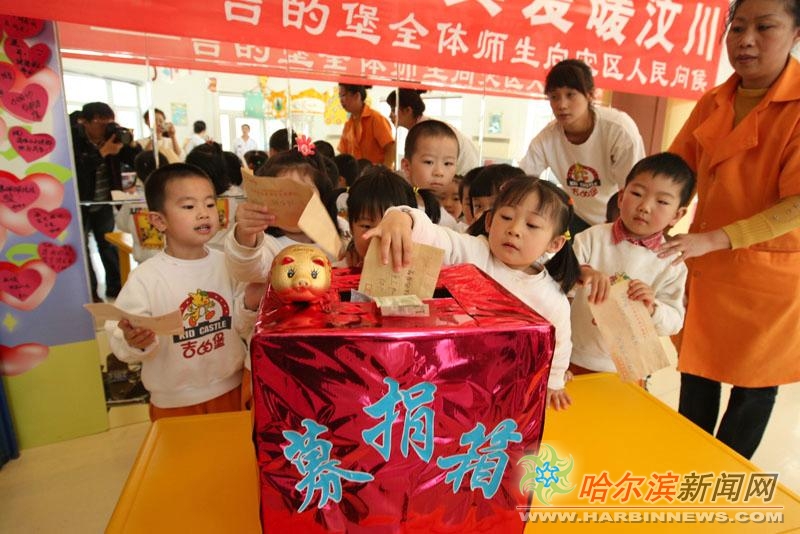 东北网5月21日讯 20日上午,哈尔滨吉的堡幼儿园的100多名孩子和教职员工,自发地向汶川大地震遇难的孩子们捐款,天真可爱的孩子们,有的拿出过年的压岁钱,有的捧来了存钱罐,共捐助爱心款23918.35元,献上自己的爱心。