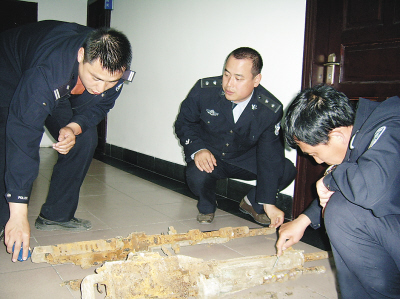 5月26日11时30分,牡丹江市东安公安分局兴隆派出所接到“110”指令:在该市党政中心东侧工地内,施工人员挖出两挺重机枪。据驾驶推土机的赵师傅介绍,他在驾驶推土机平整土地时,突然发现了一个异物。下车一看,一支管状的金属构件插在推出的土堆中。工友们将金属构件拔出,发现这竟然是1米多长、锈迹斑斑的重机枪。随后,工人们在同一堆土内又挖出一挺同样的重机枪以及两件疑似重机枪组件的金属构件。经测量,重机枪枪长119.2厘米,重约40公斤,枪身布满泥土、锈迹斑斑。据民警初步分析,挖掘出的金属构件只是重机枪的枪管与枪身,而重机枪的支架、冷却部件则未被发现。据此判断,重机枪应是被分解后掩埋的,目前只能判断出大约为日伪时期掩埋。
