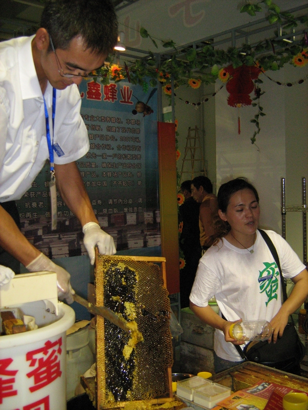 在我们北方一年中,只有七月和八月才鲜花盛开,也只有这两个月才有新鲜的蜂蜜酿出。已经连续4年参加绿博会的礼鑫蜂业,可算是在第八届绿博会上出尽了风头。在一个小时的时间里,礼鑫蜂业现酿现卖的蜂蜜就卖出1000多斤。