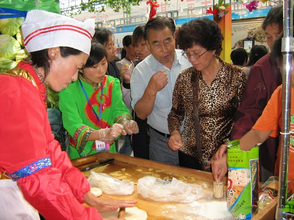 几名穿着少数民族服装的漂亮女孩,挽起袖子,在梅里斯区展柜上烙起了大饼,好多路过的市民都好奇地前来观看。原来,位于梅里斯区中国达斡尔族第一村的达英食品厂,研制出来的降糖粗纤维面粉,是利用黑小豆、玉米须、洋葱、南瓜、苦瓜、苦芥麦和玉米粉,经独特加工而成的,是糖尿病患者最理想的面粉。