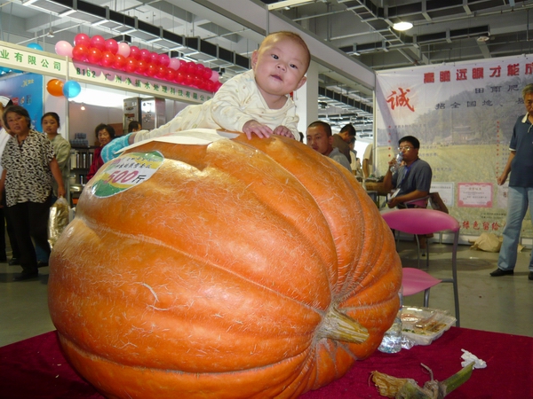 小男孩爬上500斤的巨型南瓜,休息一下也不错。
