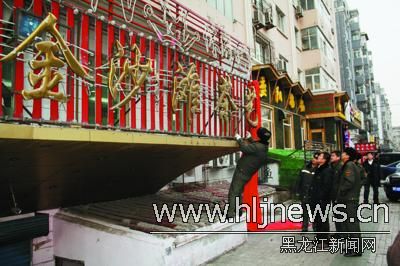 东北网12月18日讯 近日,哈尔滨市南岗区文化市场管理所的稽查人员联合南岗区城管行政执法局的执法人员对宣庆街、芦家街上的黑歌厅进行了查处,并拆除了这些黑歌厅的牌匾。