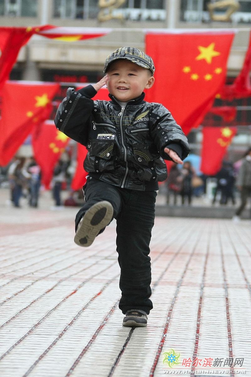 10月1日,在哈站广场,来自阿城区5岁的孩子在观看国庆阅兵时,走起了正步,接受“检阅”。