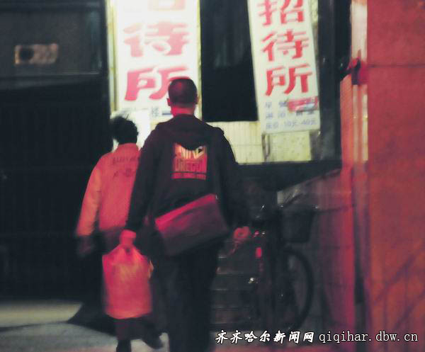 晚7时44分,佳木斯开往齐市的火车进站。在火车站出站口,随着一拨拨旅客陆续从出站口走出,一些旅店的拉客女早已等候在出站口外。在混杂的人流中,20多个拉客女分散在人群里,不时向出站旅客招揽生意。此时,记者佯装成旅客随人流往外走,一中年女子马上迎了上来。“两位住宿吗?标间,有线电视、提供茶水,每人10元。”