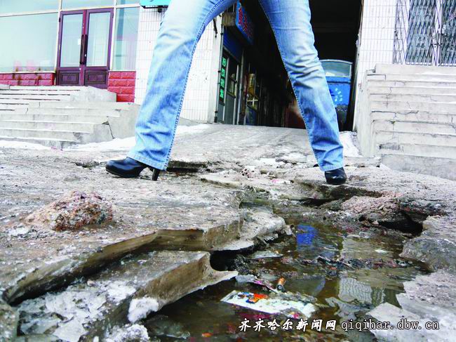 东北网齐齐哈尔3月9日讯 在中华路二○三医院交通岗往东不到10米,出现了一段“坡路”。“坡路”位于快车道与人行道之间,由大面积的冰水混合物形成,“坡顶”厚度近30厘米。自“坡路”形成,这段路面行人寥寥。