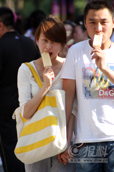 | 24日下午,哈尔滨市中央大街上,来往市民几乎人手必有冷饮。东北网记者陈静 摄 |