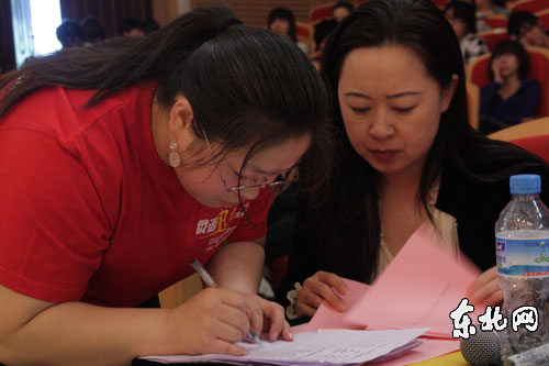 红衣志愿者温立凤(左)忙碌的身影。东北网记者王巍摄