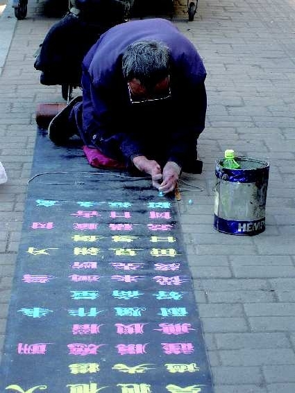 在哈尔滨、长春、沈阳、大连、烟台、威海、青岛、西安、深圳等十几座城市的街头,崔显仁靠残缺的双手写下了架构优美、俊秀大方的彩色粉笔字;他也用五颜六色的醒世之言、古香飘逸的字体、锲而不舍的精神感染了他去过的城市市民。
