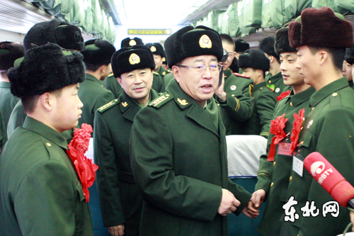 东北网11月25日讯 (宋泽超 记者李博) 25日9时,武警黑龙江总队2013年首批3000多名光荣退伍老兵告别军营踏上返乡列车。该总队司令员杨立新、政委徐国岩到火车站为老兵送行。