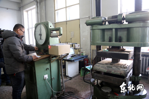 增钙粉煤灰节能非烧结砖正在进行检测。东北网记者 李博 摄