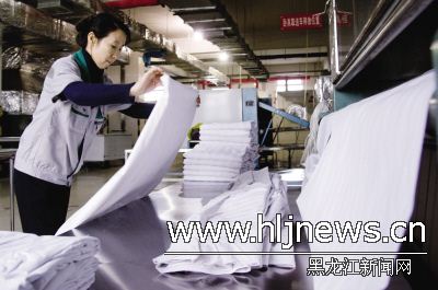 经过一个小时的严格洗涤,脏兮兮的卧具恢复了洁净。通过电梯运送到二层烫平车间,大型烫平机器将工人隔开,前面两个人配合完成烫平工作,后面工人进行整叠。“现在大家配合得非常默契了。”工人赵桂颖说。“每天一个人大概能整叠近3000件卧具。”经过整叠的卧具推送至库房进行数量清点打包,等待专人过来装车运走,送回火车上。据车间工长刘立民介绍,整个洗涤车间有670多名工人,一个班组100人,直接负责哈尔滨铁路局发车的车辆卧具的洗涤工作,一天能洗涤约五万件,每天车间24小时不间断工作,中午很多人都是带饭在车间吃。
