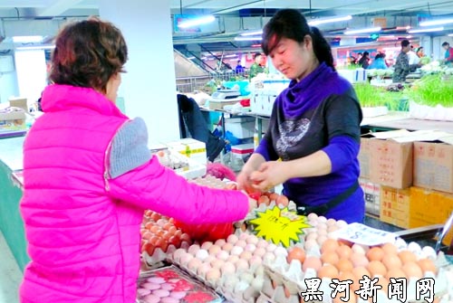 东北网月13日讯3月9日,市民在黑河双福商城选购鸡蛋。据悉,当日,黑河市鸡蛋价格为每公斤7.8元,与去年同期相比下降约10%。