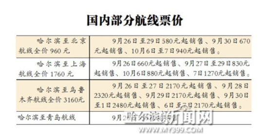 据介绍,从目前来看,前往厦门、昆明、广州、乌鲁木齐等旅游热点城市的机票销售比较好;北京、上海、烟台、漠河等短途或省内航线,凭借城市热点和时间优势,同样受到旅客的欢迎;随着北方气温降低,很多老年人也开始计划去南方“猫冬”,三亚、海口等航线的销售情况也比较火爆;台湾、首尔、新潟等地,正处旅游较好时节,也成为市民出行的首选之一。9月30日、10月6日、7日,去往北京、上海、乌鲁木齐等航线机票较紧张。