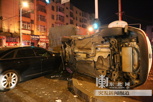 23时50分,记者闻讯赶到现场看到,一辆白色福克斯轿车侧立在人行道上,副驾驶一侧着地,天窗开启着,车内杂物散落;黑色奥迪轿车前脸破损严重,两辆车内部的安全气囊均已爆开。一辆停靠在路边的小型货车“中枪”被黑色奥迪轿车“追尾”。