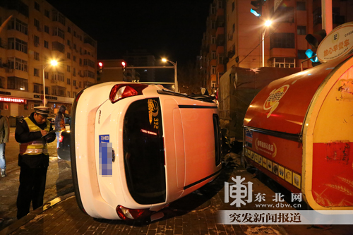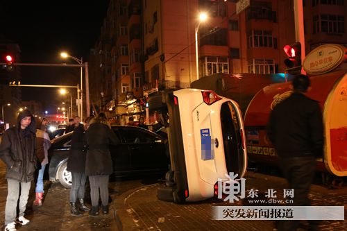 东北网11月14日 (记者 那鹏翔 许诺) 13日23时40许,在哈尔滨市南岗区芦家街和十字街交界处,一辆白色福克斯轿车和一辆黑色奥迪轿车相撞,白色轿车被撞侧翻在人行道上。庆幸的是,事故没有造成人员伤亡。
