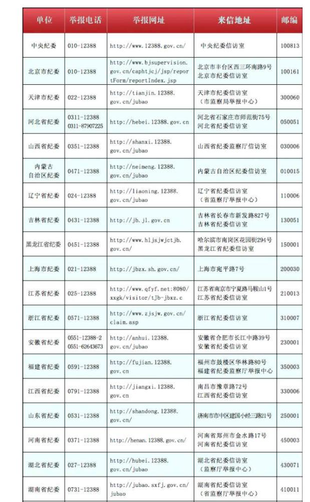 中纪委集中公布各地纪委联系方式 黑龙江省纪委:12388