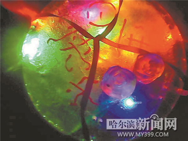 “冰灯蛋糕”的冰壳里装有LED灯,点亮后五光十色。