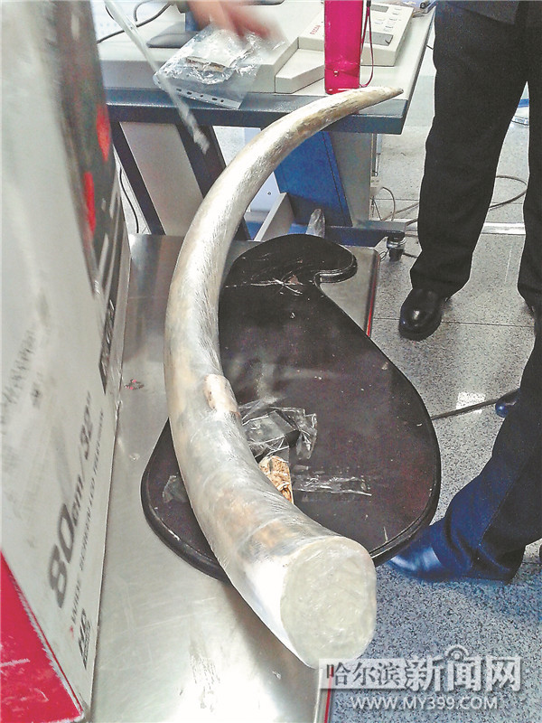 据介绍,黑龙江出入境检验检疫局哈尔滨机场办事处工作人员在对来自俄罗斯的旅客进行现场检疫查验时,发现一名中国籍乘客携带10公斤猛犸象牙。携带人不能提供有效的《动物检疫许可证》及《官方兽医证书》。工作人员根据相关法律法规,对猛犸象牙依法截留,并将在限期内将该批猛犸象牙退回俄罗斯。这是我市首次从入境旅客携带物中截获猛犸象牙。