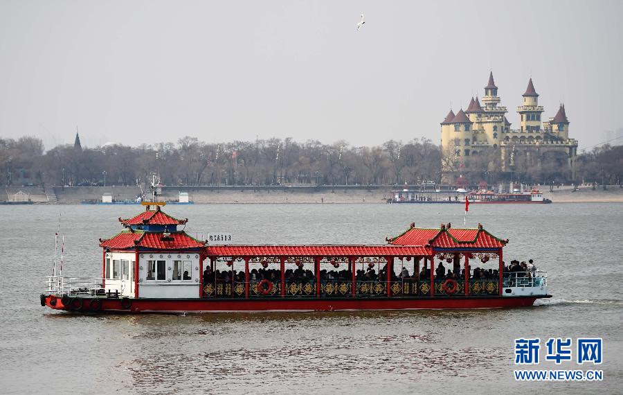 4月15日,一艘旅游轮渡船行驶在松花江哈尔滨段。新华社记者王建威摄