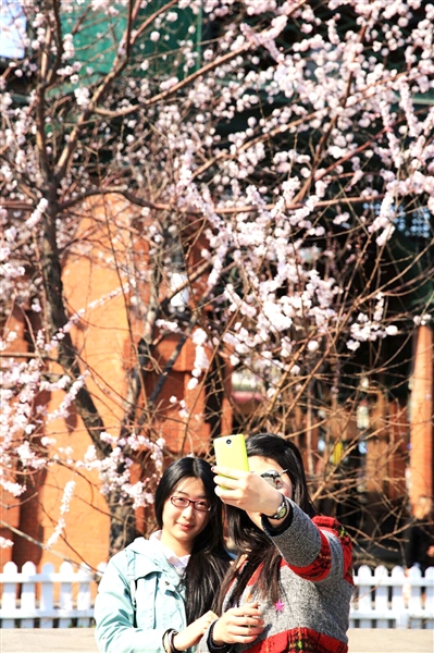 索菲亚教堂前桃花朵朵开 美景之下游人自拍停不下来(组图)