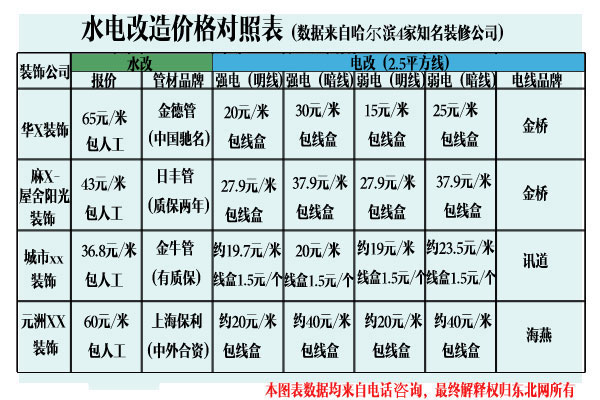 哈市装饰协会俞秘书长提醒消费者,水电改造费用每家装修公司不仅收取费用标准各不相同,连使用的管材和电线的品牌都大相径庭,一定要在签订合同前了解清楚,该公司使用何种品牌的产品,并标注在合同里,不要光看价格,图便宜酿大祸。