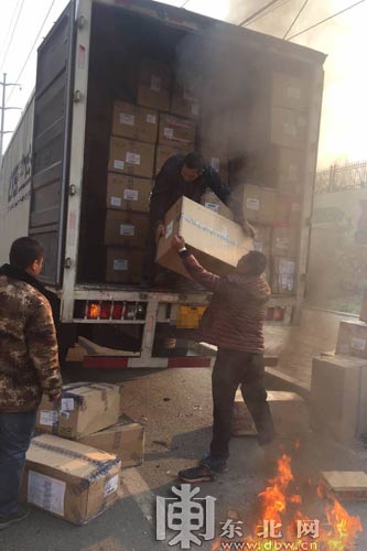 说明情况后司机与助手立即下车打开货箱。车厢里装着成箱的鞋子,有两个纸箱子有明火在燃烧,二人立即将着火的两个“鞋箱子”扔到了道边,辅警也上前一同将火扑灭,避免了更大的火灾发生。