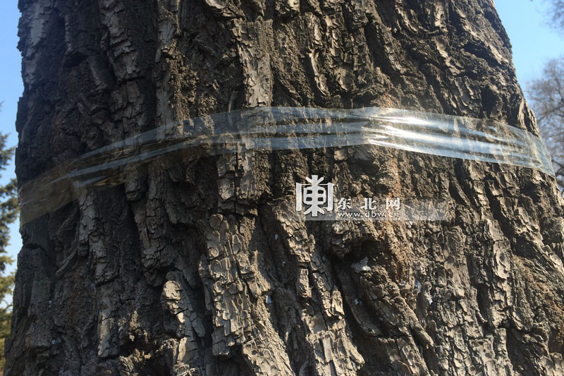 包裹上塑料胶布的大榆树。东北网记者 白林鹤 摄