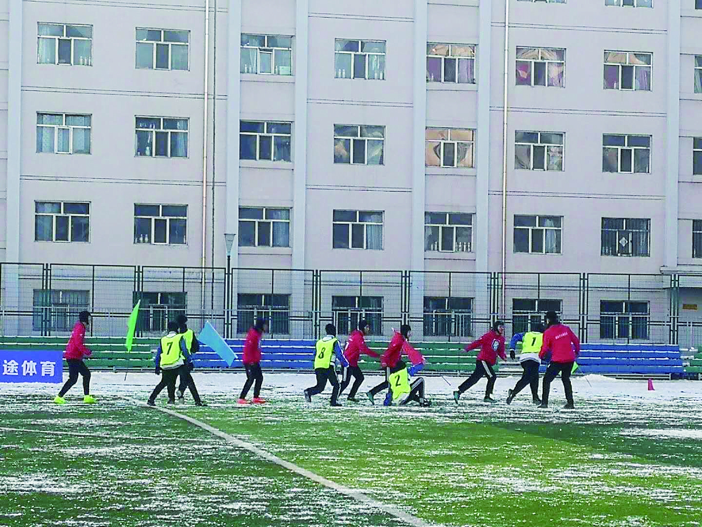 据田汝涛介绍,他们的队伍是在2018年年底成立的,都是在校的高中生(没有体育特长生)。因为很多人对于橄榄球有误区,认为冲撞性太强,容易受伤,所以老师要求15名队员必须要征得家长同意。训练中孩子们最常犯的错误就是前穿和跑位,并且还要克服由于场地局限带来的问题,不过,孩子们还是很喜欢这项运动,训练结束后经常是顶着一头的白霜回到教室。这个雪地橄榄球其实就是从英式橄榄球的“菜鸟”级比赛延伸过来的,英式没有美式那么强烈的冲撞以及厚实的护具,对于运动员的整体协作、身体素质、随机应变的能力有很高的要求,是一项男子汉的运动。
