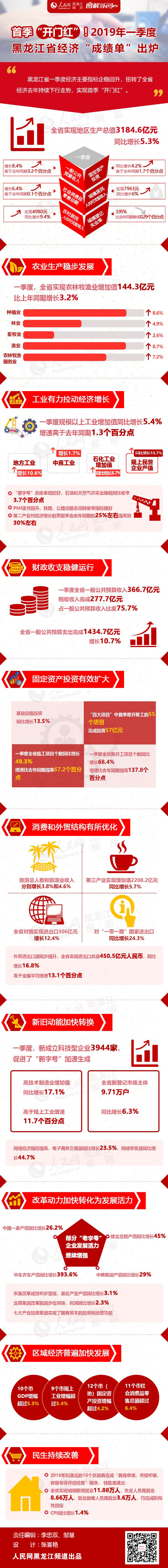 长期在低位运行的黑龙江经济传出好消息!记者从黑龙江省统计局获悉,2019年一季度全省实现地区生产总值3184.6亿元,同比增长5.3%,有效遏止了去年GDP逐季回落态势。一季度,全省实现进出口总值450.5亿元,比上年同期增长16.8%;一季度黑龙江全省施工项目个数和新开工项目个数同比分别增长49.3%和68.4%,“百大项目”中首季度开复工的有55个项目……