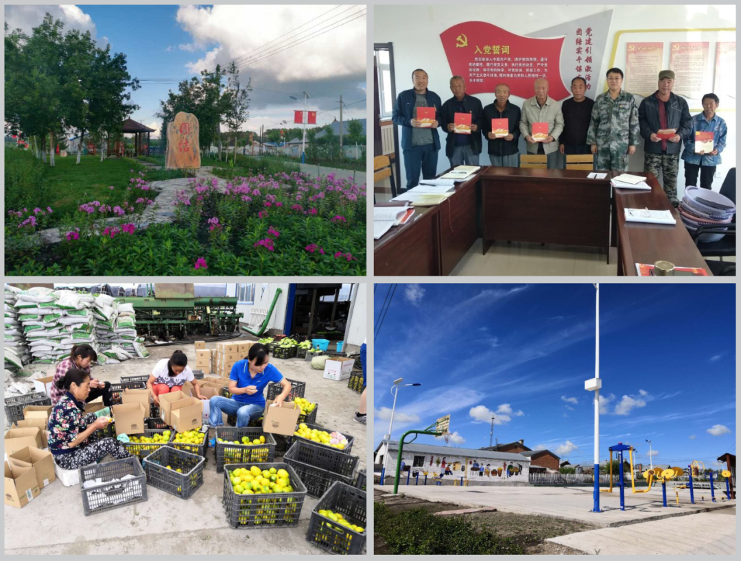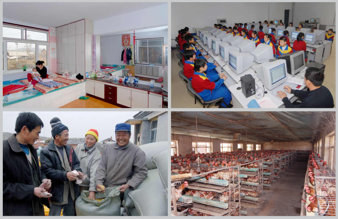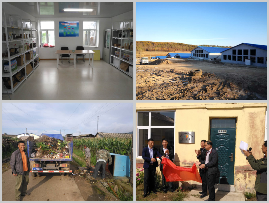 省委办公厅驻哈尔滨市延寿县青川乡新民村扶贫工作队扶贫项目(从左至右):(1)线上电商平台、线下电商服务站;(2)大型肉鸡养殖基地;(3)垃圾集中处理(全村72个垃圾箱,贫困户公益岗清运);(4)爱心屋超市(宗旨:助力脱贫攻坚、树立文明乡风)。