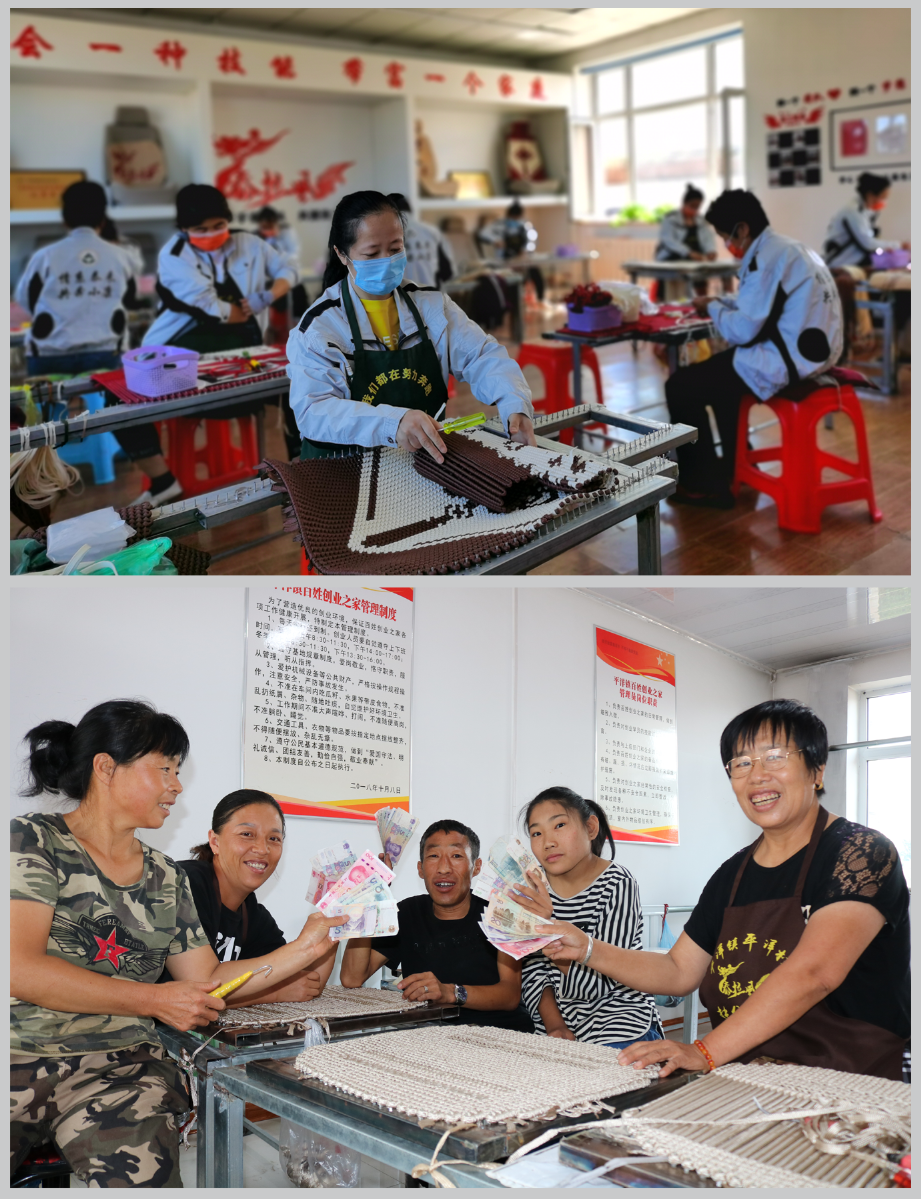 《泰来县的扶贫车间》齐齐哈尔市泰来县通过扶贫车间招收贫困员工生产编织工艺品。上图:又一幅编织作品在泰来镇繁荣村扶贫车间员工手中完成,承载着她们增收致富的希望。下图:平洋镇平洋村扶贫车间几位员工拿到近期编织的工资后,脸上洋溢出幸福的笑容。