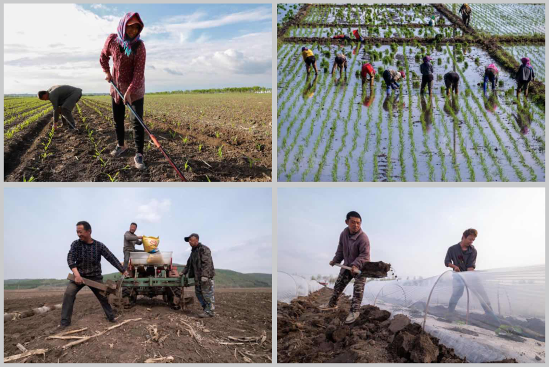《春播忙》哈尔滨市阿城平山周边农村春播的忙碌场面,农民们正在施复合肥,扣地膜,种水稻田,力争增产增收。