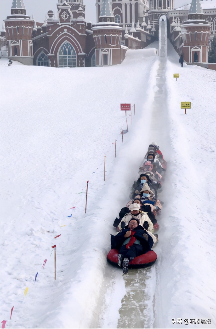 除了参观俄罗斯风格建筑,伏尔加庄园还可以品酒、滑雪、研学等。坐着轮胎从五楼高的滑道上呼啸而下,激荡起的雪花三尺多高,刺激与趣味并存,让诸多游客享受到了北方特有的玩乐。