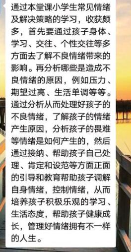 一位家长告诉记者:“以前我常对孩子发飙,听了课程后,我知道了应该学会管理情绪,这也是为了家庭和谐和身体健康。”还有的家长认真做了笔记:“这正是一年级家长所需要的,点赞!”不少家长说,听课后也进行了反思,发现以前很多处理方法是错的,真的是受益匪浅!