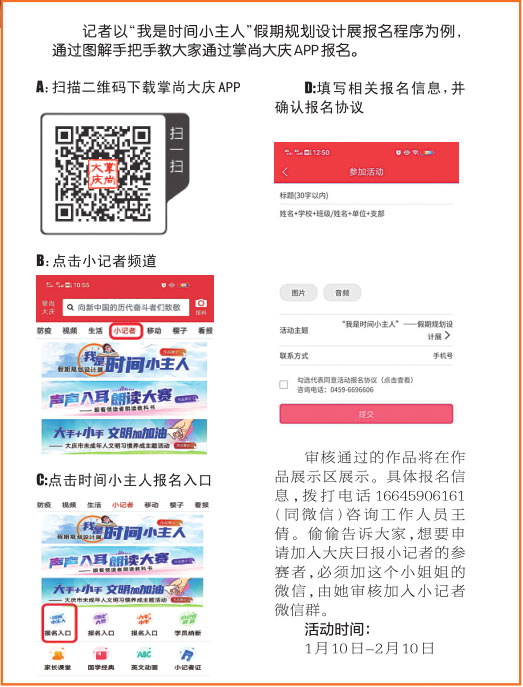 记者推荐大家下载掌尚大庆APP,登陆小记者专属频道进行报名,不仅可以参加这次活动,还可以报名成为大庆日报小记者,享受活动报名、预告通知、分享展示、成长记录、教育资讯等一站式服务。