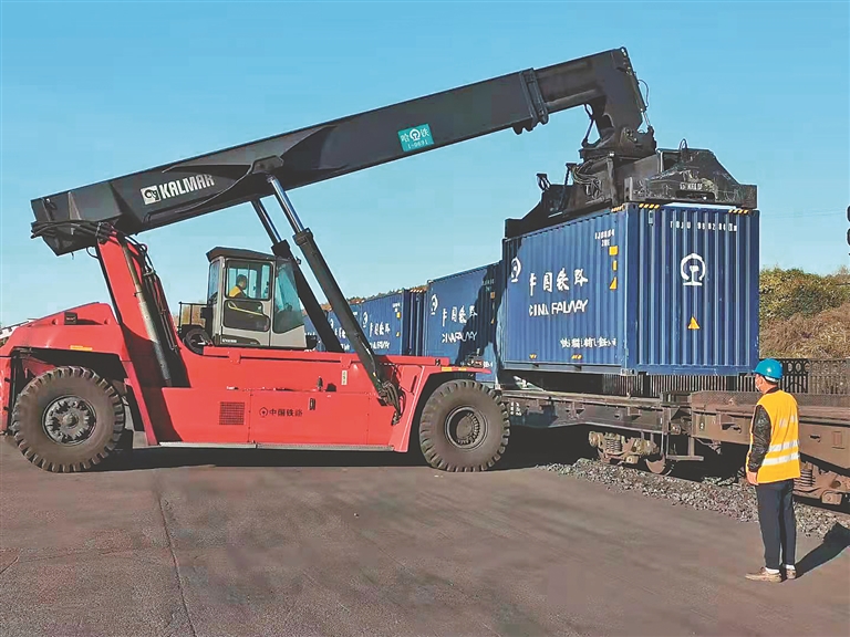 绥芬河站换装场内煤炭在有序换装。